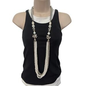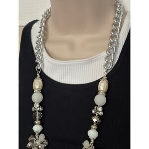 Women's Multi-Strand Statement Chunky White Beaded Silver Tone Chain Necklace