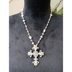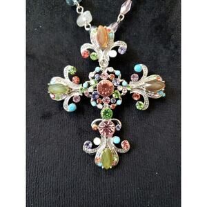 Women's Multicolor Crystal Cross Pendant Necklace with Ornate Beaded Chain