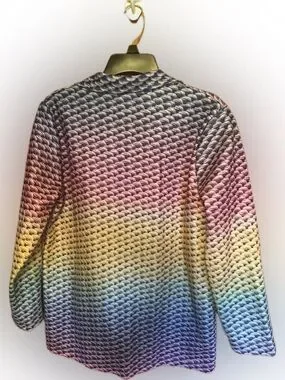 Multicolor gradient shirt jacket with a relaxed button-up silhouette. Features a classic collar and front patch pockets for a casual, polished look. Versatile, perfect for layering in transitional weather. Includes pink button accents and a subtle woven texture.
