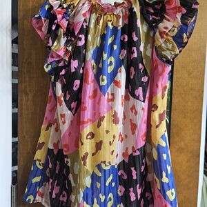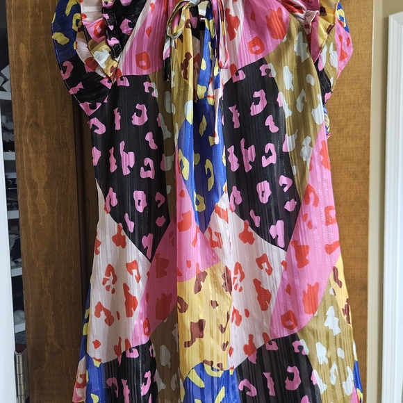 Eye-catching multicolor leopard-print blouse with playful ruffle and tie details. Lightweight, pleated fabric for comfortable all-day wear. Vibrant pink, black, gold and blue panels create a fun, modern look. Easy to dress up or down for parties and special occasions.