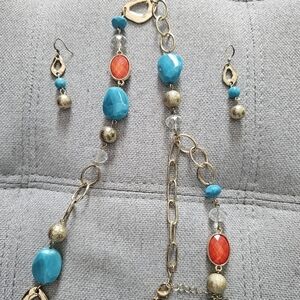 Elegant gold chain with turquoise and coral beads. Matching earrings included. Perfect for any occasion.