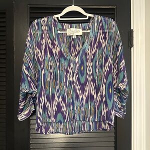 Stylish and vibrant, this multicolor patterned top is perfect for any occasion. The blend of blue and purple hues adds a pop of color to your wardrobe. Pair it with your favorite jeans or skirt for a chic look.