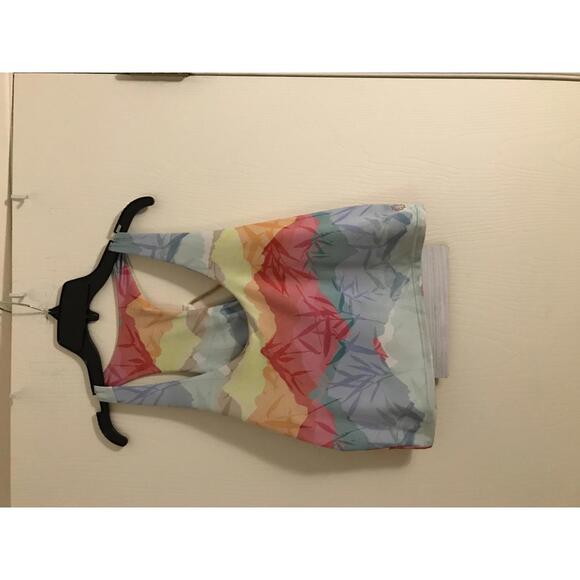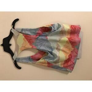 Lightweight women's tank top featuring a vibrant multicolor pattern with mountain and floral motifs.