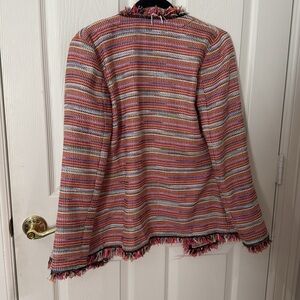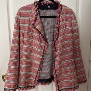 Vintage W by worth blazer size small. Elevate your style with this chic multicolor striped jacket. On a array of colors, mostly pink and orange. There are belt loops to add a belt or a tie. No front closure. Ruffled him. Perfect condition. Smoke free home.