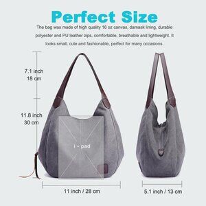 Dimensions : Medium size: 11" x 5.1" x 11.8" ; Large size: 13" x 7.1" x 15" . Magnetic snap and zippered closing, easy to open quickly. Perfectly be used as a tote bag, shoulder bag, handbag, beach bag.
