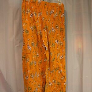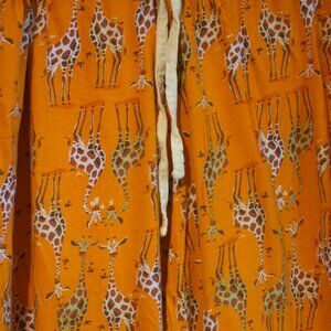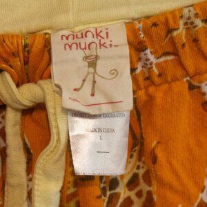 These Munki Munki women's size large sleep pants with giraffe prints are in good pre-owned condition. There were no stains rips or tears noted in the pants. These pants are made from 60% cotton and 40% rayon. They are a size large with a drawstring and an elastic waist. The elastic waist does have good stretch to them. The waist measues about 14 inches from hip to hip lying flat. They measure about 35 inches from waist to bottom.