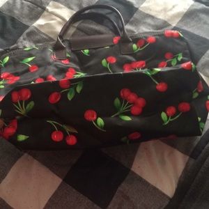 Great for travel , vacation, carry on flight , bag , cherries , fruit , watermelon , banana , berries , apple , strawberry , melon , maraschino , satchel, neverfull duffle , backpack , beach , leopard print, cosmetic , clutch