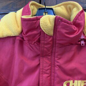 Stay warm while cheering on the Kansas City Chiefs to the Superbowl. Official NFL coat featuring the Kansas City Chiefs arrowhead with red KC in the middle across the back of the coat. The word Chiefs is embroidered across the left chest. The hood has a zipper for easy removal and a Velcro closure at the neck for added warmth. The sleeves feature a warp around Velcro band to help keep wind out. There is a pocket on each side. Zipper closure up the front. The colors are standard Chiefs colors. It's fully lined in the hood, coat and sleeves. The shell, lining and filler are 100% polyester.