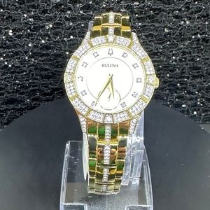 Women's NWT Bulova Mother-of-Pearl Faced w/Diamonds & Crystal Bezel & Gold Band