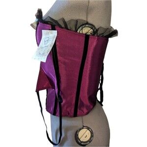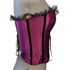Women's NWT Empire Intimates Fuschia Lace Up Overbust Corset, Size 40. Overbust style. Hook front, lace up back. Ruffle top hem, with two small flowers. Black strips are velvet. Assumed to have plastic boning; no modesty panel. New condition, no flaws. Comes with matching thong, attached to the tag. Love FiFi Ltd by Empire Intimates.