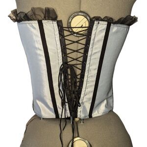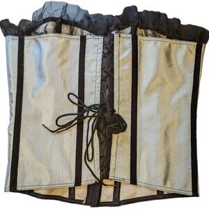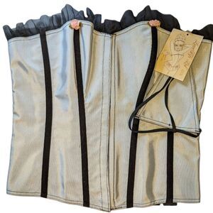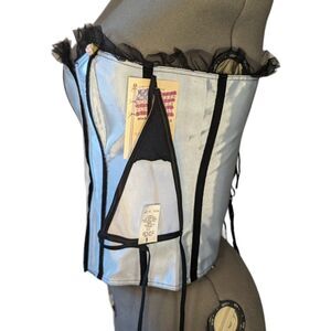 Women's NWT Empire Intimates Light Blue Lace Up Overbust Corset, Size 40. Overbust style. Hook front, lace up back. Ruffle top hem, with two small flowers. Black strips are velvet. Assumed to have plastic boning; no modesty panel. New condition, no flaws. Comes with matching thong, attached to the tag. Love FiFi Ltd by Empire Intimates.