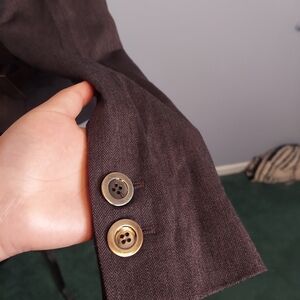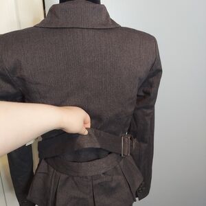 •Women's NWT FYLO By. NYLON Dark Grey Herringbone Belted Stretch Jacket Blazer. Brand new with tags. Dark grey Blazer size 6 with belt. I couldn't figure out how to show the belt on so I wrapped it in the back. The Blazer is super cute. The inside of the Blazer is purple, grey and black striped. The outside of the Blazer has a cool design and is Dark grey. There are 4 big buttons in front for closure they are silver. The pockets are just for design there not real pockets. Has two buttons on both arms at the wrist they are silver. Has thick shoulder material its like padding. Nwt, Bundle for a better price!