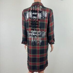 Multi Color plaid shirt dress with silver paint and spell out word accent.