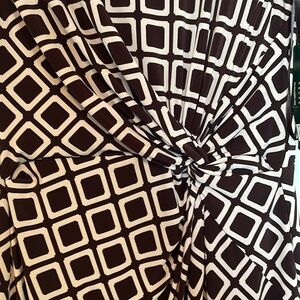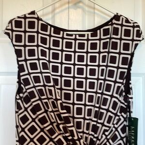 Women’s NWT Lauren Ralph Lauren Sz 14 dress sleeveless brown white square design. Lined. Gathered off center at left 19” pit to pit 42” shoulder to hem. See last pics of top right shoulder