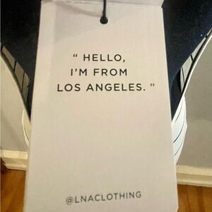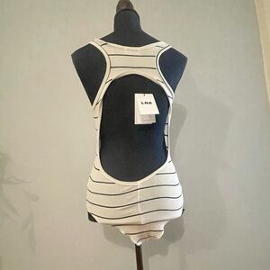 New with tags. Adorable LNA bodysuit with open back. Cream colored with blue stripes. Super soft. 95% rayon & 5% spandex for a flattering fit. Lots of stretch, can fit a curvy size medium too. Tag says size small. Questions? Leave a comment below!
