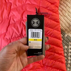 women’s NWT under armor jacket. Really pretty color: like a reddish/pink! Size medium. Zippers works great.