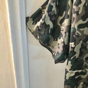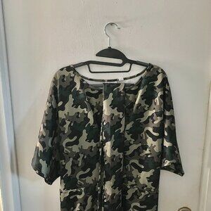 NY & Co. Camouflage Dress. Colors are tan, army green, black, and olive green. Never worn before and still in GREAT condition. The neck is considered a wide neck. A camo belt is included. The belt loop threading is no longer there, so the belt is loose. You can wrap the belt towards the front or to the back. The dress features a V-shape toward the belly and has a cinched waist with elasticity. It is a pullover dress with no buttons or zippers. There is a lot of stretching in the material. Has a slit down the front of the dress. Material is listed as 95% polyester and 5% spandex. Measurments can be found below.