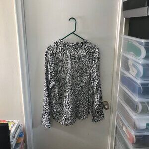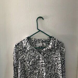 Women's black and white scripted letter design shirt. Long Sleeve. In EXCELLENT condition. Only worn 1 time. Materials are listed as 98% cotton and 2% spandex. Measurements can be found below: