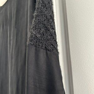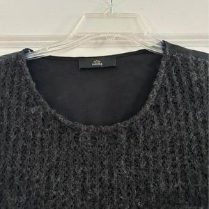 Beautiful women's pull over sweater from Montreal. 22"w x 21"h (26"h in back), 22" sleeves. Front is dark grey knitted cotton with ribbon around neck & fake chest pocket. Back & sleeves are faux suede material. Sleeves have one-button accent. Machine wash cold, tumble dry low inside out.