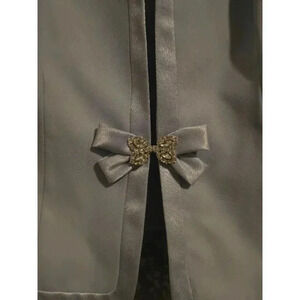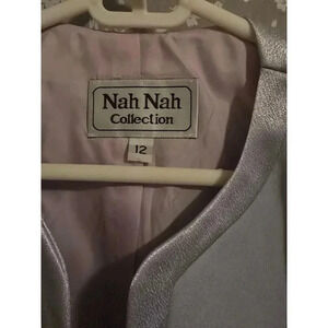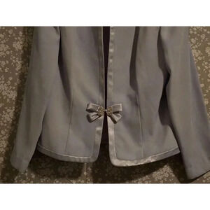Pre-owned Nah Nah Collection women's blazer, size 12. Light blue polyester with lavender satin trim and a rhinestone bow detail. The jacket is in good condition with no significant flaws. The material is 100% polyester with 100% acetate lining. Dry clean only.