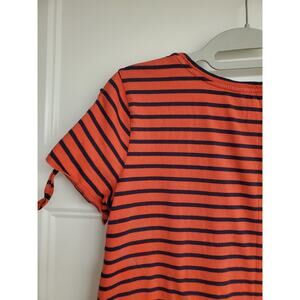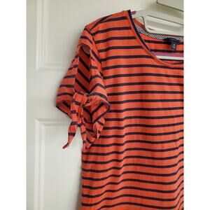 Excellent condition, women's Nautica navy and coral striped tee with cutout tie sleeves. This top is 100% cotton and has minimal stretch.