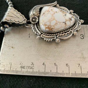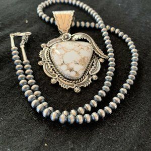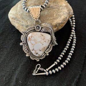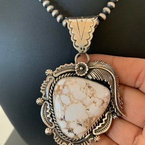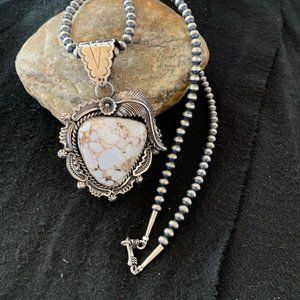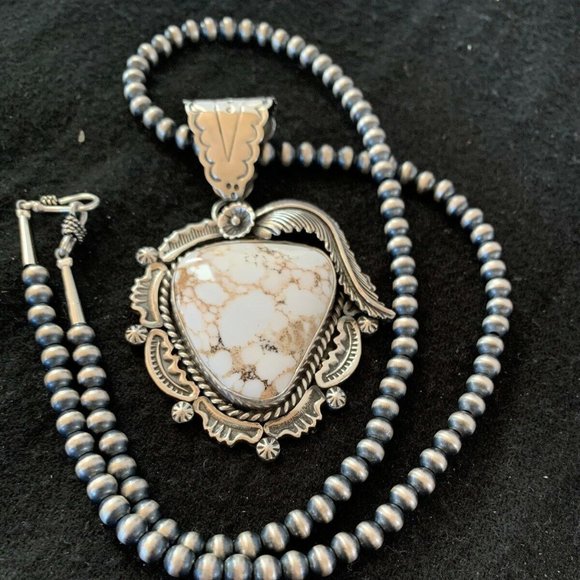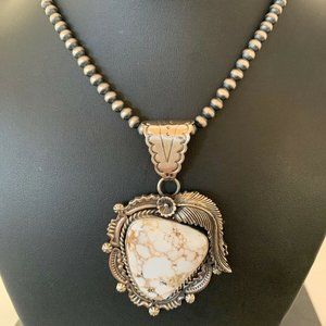 • The White Buffalo Turquoise Necklace and Pendant has a beautiful matrix, with a strand of Silver Beads add this Signed pendant necklace a class of its own.