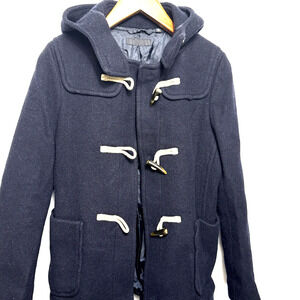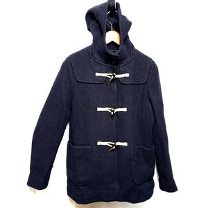 Women's Navy Blue Wool Blend Coat Duffle Nautical Style Hooded Lined Size M EUC