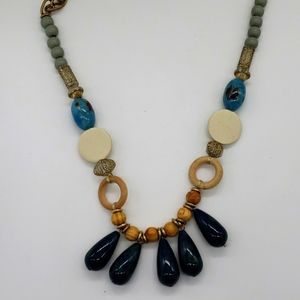 Women's Navy and Beaded Wood Long Statement Necklace