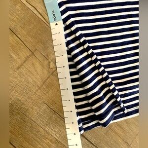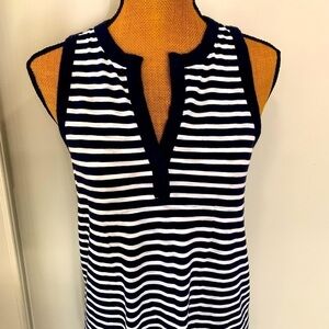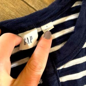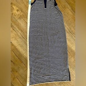 Women's Navy and White stripe, ankle length, GAP sleeveless dress. Small slit at bottom of dress measuring approximately 10 inches.