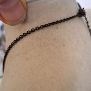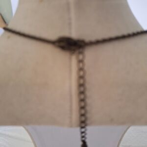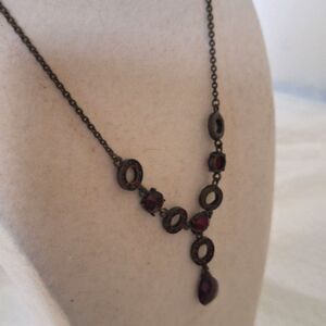 This piece is made to look really old, but it is probably from the 90's. It has a dark gunmetal chain with ruby red glass rhinestones . This piece has a very dark menacing appearance, but could possibly clean up to be a little brighter. It is 16" long with a 3" extender, and appears to be in very good pre-owned condition. This would be a great piece for a Cosplay costume or a Victorian Vampire ensemble.