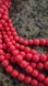 Pre-owned multi-strand necklace featuring approximately six strands of uniformly sized, round, coral-red beads. The beads appear to be made of plastic or resin. The necklace measures approximately 16 inches in length with a 2-inch extender chain. The clasp is a silver-toned lobster claw closure attached to a short silver-toned chain. Beads are consistently sized and colored; no visible damage or significant wear is observed. Brand and model are not identifiable.