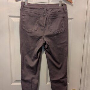These jeans are by Needle & Cloth. They are a size 4 and a medium gray. They are made of 68% cotton, 29% polyester, and 3% spandex. Even though they are only 3% spandex they have a very stretchy feel to them. They also have more of a shiny appearance to them than a regular jean. These jeans have been worn lightly and are in excellent condition. They are a little more fashionable than regular jeans but will still serve any purpose you want them to from stylish to utility.