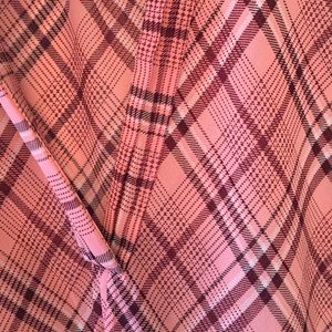 Pink and maroons. Great alone or under a blazer. Sheer material