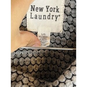 The Women's New York Laundry Asymmetric Cowl Neck Sweater in Black/Grey, size Large, is a stylish and versatile piece perfect for casual occasions during the winter, fall, and spring seasons. Made of a comfortable blend of 80% polyester, 15% rayon, and 5% spandex, this knit sweater features a geometric pattern, long sleeves, and a relaxed fit. The cowl neck adds a trendy touch, while the button accents add a subtle detail to the pullover style. Easy to care for, this sweater is machine washable and lightweight, making it a practical and stylish addition to any woman's wardrobe.