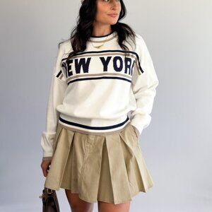 A classic New York moment—without the plane ticket. This varsity-inspired knit sweater features bold “NEW YORK” lettering framed by twin stripes, a crew neckline, and ribbed trim. The relaxed, layer-friendly fit works with pleated minis, denim, or slip skirts for that effortless city-cool look from weekday to weekend. Why You'll Love It: 50% rayon, 28% nylon. 22% polyester Stretch knit Feels soft Ivory Varsity style Crewneck Relaxed fit Classic style Size & Fit: The Women’s New York Varsity Knit Sweater fits relaxed. The knit is very soft and stretchy. The body fits boxy and the ribbed hem has a tailored fit. If you are in between sizes you may be able to size down. The model is wearing size small. XS - Chest: 42", Length: 23" S - Chest: 44", Length: 24" M - Chest: 46", Length: 24" L - Chest: 48", Length: 25" Model Info: 5'5 140lbs Waist: 28" Hips: 39" Inseam: 29" Typical size: S, M, 6/8, 27