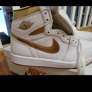 Size 9.5 Women's Nike Air Jordans 1 Retro Hi OG. Color White/Gold. Most definitely be a mens sneaker as well. New, never worn.
