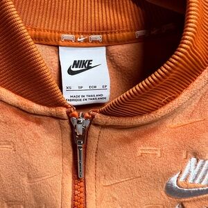 Stylish Nike bomber jacket. Vibrant orange color. Features front zipper and pockets. Comfortable and trendy design.