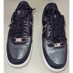 The product is a women's Nike Court Vision Low Premium sneaker in Cave Purple, size 6. This low-top shoe features a lace-up closure, solid purple color with glitter accents, and the Nike logo on the upper material. Made with leather, this athletic shoe is part of the Nike Court product line and was released in 2021. Perfect for casual or athletic wear, this stylish and trendy sneaker is a must-have for any fashion-forward woman's shoe collection.