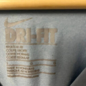 Introducing sporty comfort with this Women’s Nike Dri-Fit T-Shirt in a versatile Large size. Made from 100% polyester, this shirt offers superior moisture-wicking properties to keep you dry and comfortable during workouts or everyday activities. Its classic Nike design adds a touch of athletic style to any ensemble. In good condition and meticulously cared for, this shirt is ready to become a staple in your activewear collection. Don't miss out on adding this essential piece from Nike to your wardrobe! See included pictures for measurements.
