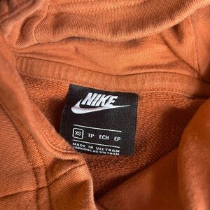 Comfortable Nike sweatshirt in Rust. Features a cozy hood and classic design.