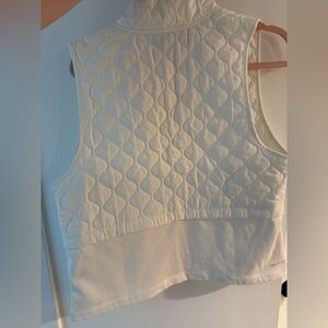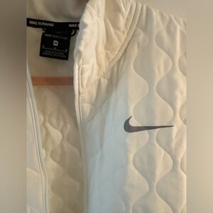 Medium women’s ivory quilted running vest, runs a little big for Nike but super comfortable and breathable. Worn a few times for some winter runs and kept me warm! In great shape, no blemishes, threads or pilling.