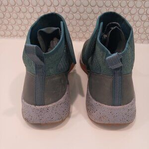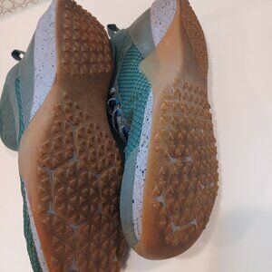 Used but good condition--worn about five times. One shoe lace is a little fuzzy from getting caught in velcro (see pic). Teal, green gray color.