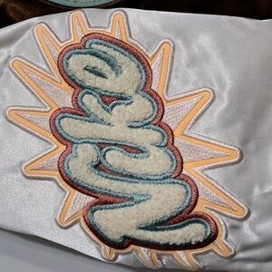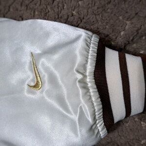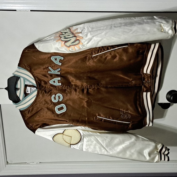 Rare Naomi Osaka Nike Bomber Jacket from her 2023 Collection. Great gift for any tennis lover! Beautiful Jacket with so much detail. size Medium/Tall. Brand new with tags. full embroidered stiching and patches.jacket zips and snaps in front. small pocket inside with official osaka/nike sportswear patch. beautiful coppery brown color with cream sleeves and light blue accents. Measures 25" pit to pit. bottom measures 22" with stretchy striped material. 25" shoulder to bottom. 20" pit to sleeve bottom.