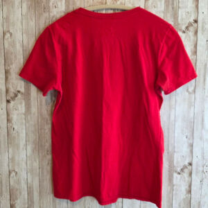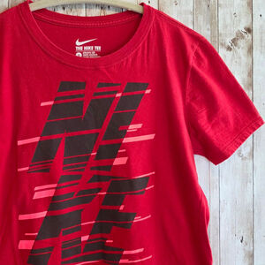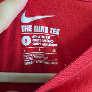 This is a pre-owned Nike 'The Nike Tee' in size small. The red athletic cut t-shirt features a graphic design on the front. The shirt is made of 100% cotton. There are no visible stains, tears, or holes.