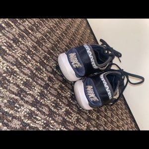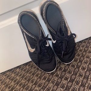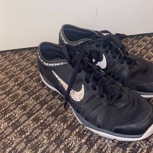 These Nike running shoes have been loved, but are still an adorable blingy pair of tennies! The shoes are black and white featuring Swarovski AB crystals on the outside Nike logos and the Nike brand name on the back. These are genuine Swarovski crystals that were hand placed and sparkle beautifully in the light. Please note, very few crystals are missing from the shoes. Original retail for shoes and crystals is $200.