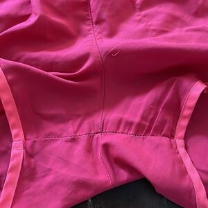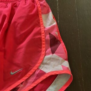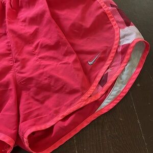 Good condition - Women's Nike Tempo Dri-Fit Running Workout Shorts. Has a drawstring waistband and a small pocket inside the waistband on the back. Has small snags on the front and small holes in the mesh, as pictured. Colors: red/pink, white, and pink. Size: M.