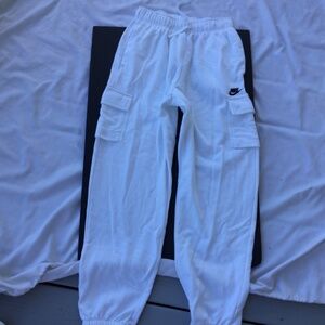 Women’s Nike White Sweatpants, 2 Side pockets with Snaps, XSmall. The size is Xsmal, but a small or medium could wear these, please review the measurements. 80% cotton , 20% polyester. Elastic waist with drawstring, waist circumference 28 inches, inner thigh 29 inches. Super soft.