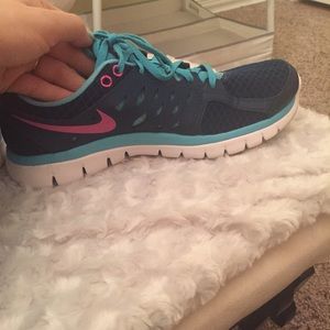 Navy teal and pink Nike running shoes.