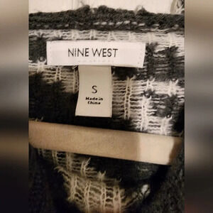 Nine West animal print sweater hoodie size small..Stretchy fit..Sweater looks black and white but is actually hunter green and white..Great condition
