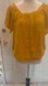 This is a pre-owned, mustard-yellow, off-the-shoulder blouse by Bounties, size XXL/2XG (19). The shell is 93% nylon and 7% spandex, with a 100% polyester lining. It features short sleeves, a ruffled neckline, and a button-down front with four wooden buttons. The blouse has a lace overlay. No visible imperfections are noted. The label indicates the yarn is made of 100% recycled polyester materials.